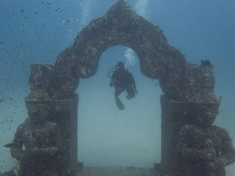 Away from the shallow reef is another artificial reef, which was placed there in 2006. This makes an interesting dive as it comprises of two life size elephants, a giant clam, and two temples. All of the concrete features now have some coral growth on them and are attracting marine life into this sandy-bottomed area. A mooring line descending to one of the statues can reach the site; you can swim into the shallow area after spending some time around the statures.